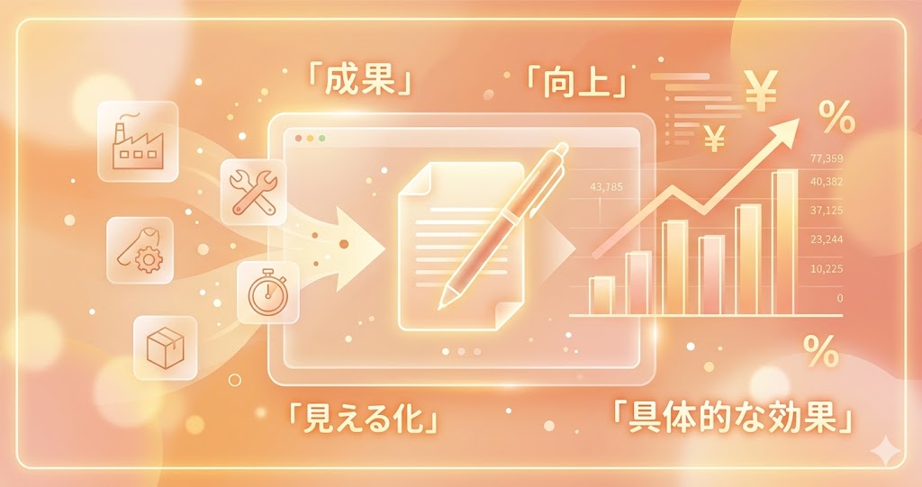 設備の性能はあくまで理由です。効果として示すべきなのは、不良率、再加工回数、材料ロス、工数削減額などです。性能から結果までをつなげて初めて、審査員に伝わる文章になります。